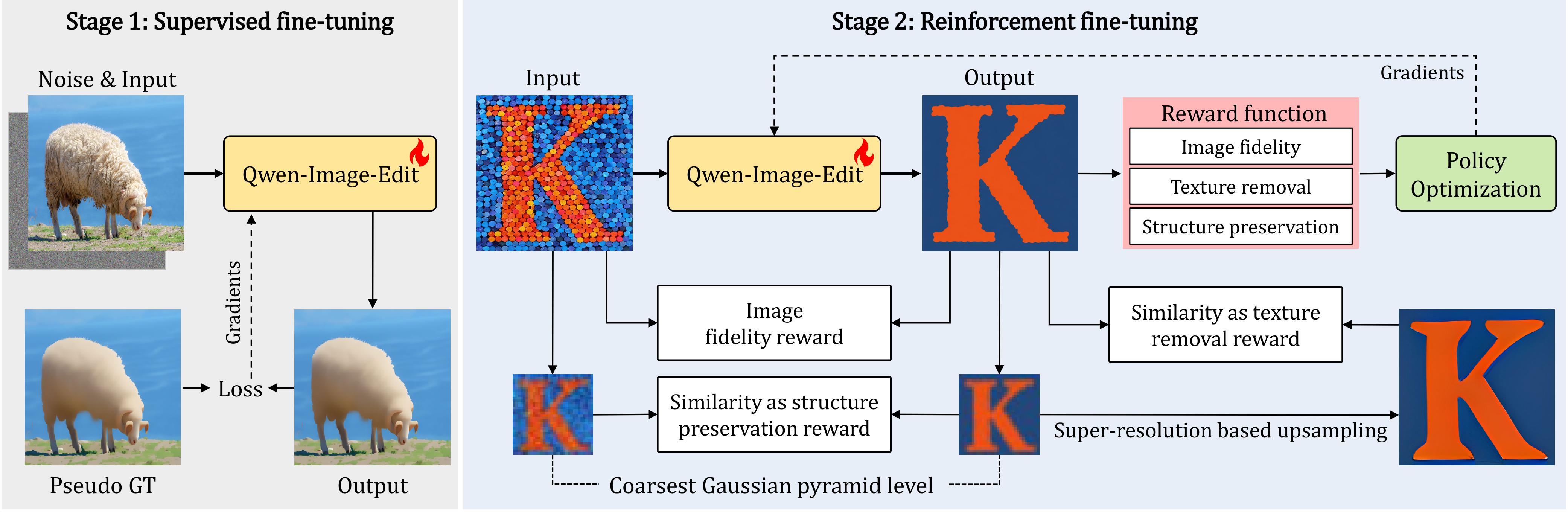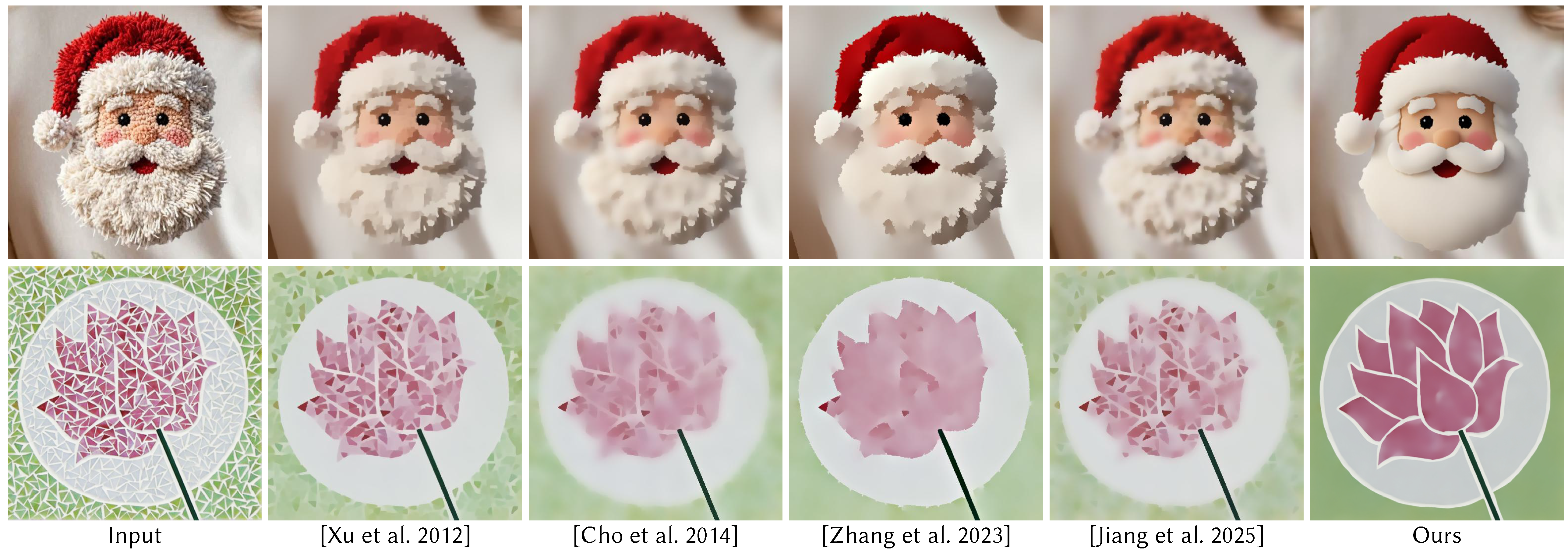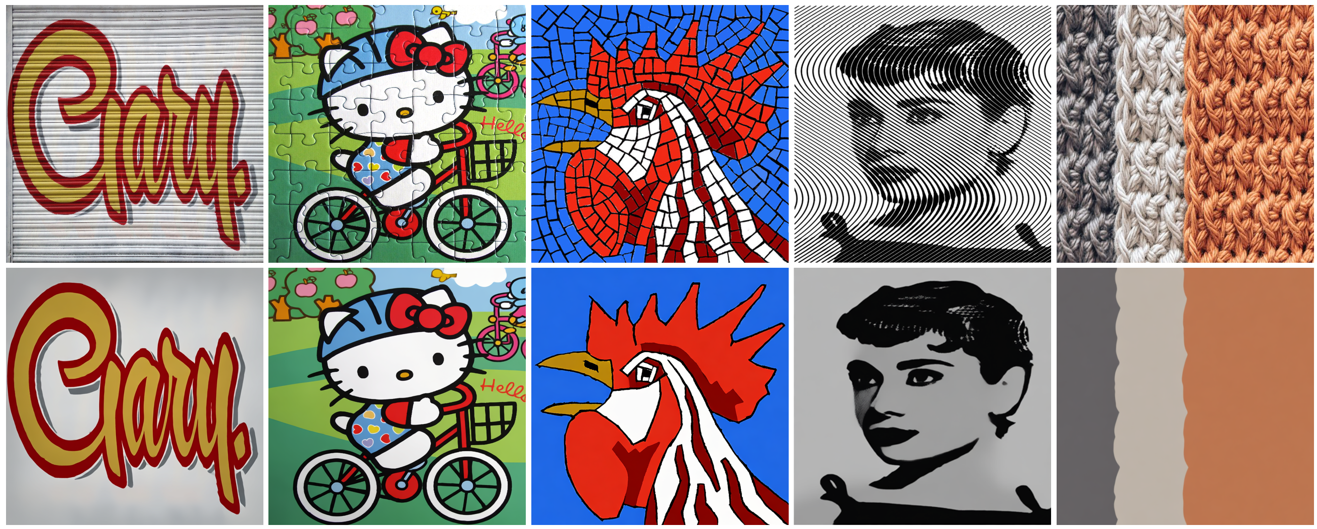 We achieve generative texture filtering with strong performance and generalization ability by fine-tuning a pre-trained generative model. Top and bottom are the input images and our texture filtering results, respectively.
